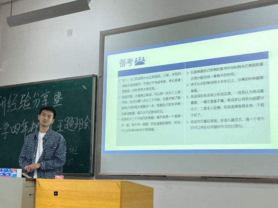 分享会上,谢雍哲、帅佳斌、邓尔康三位同学结合自身的考研经历,先后围绕考研与就业、考研动机与心态、备考方法、应试技巧、复试、调剂、专硕和学硕的区别等方面向大家做了详细的介绍,并就如何高效制定学习计划、如何平衡专业课与公共课复习时间分享了自己的经验,尤其是在择校、参考书的选择、资料信息的收集、复习时间的安排、对报考专业前景的看法等同学们普遍关心的热点,细致耐心地与参会同学进行了分享。