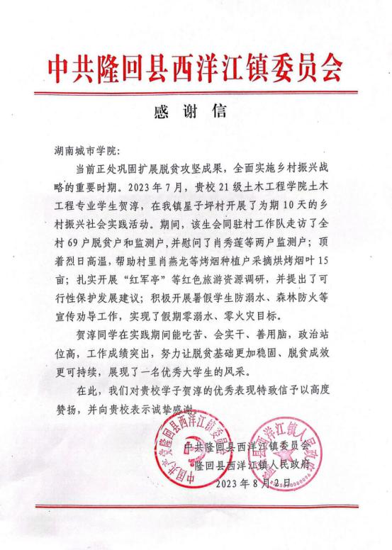 近日,学校和学院分别收到共青团隆回县委、中共隆回县西洋江镇委员会和镇人民政府发来的《感谢信》,对我院2103304班土木工程专业学生贺淳暑假服务乡村振兴社会实践志愿者活动给予高度赞扬并表示诚挚谢意。