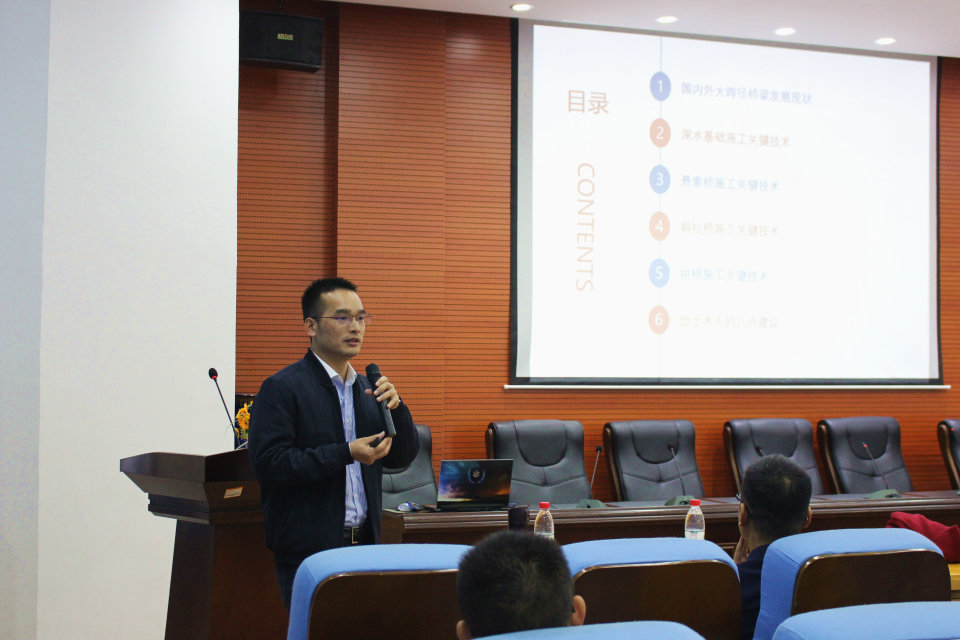首先,项超群进行了“大跨径桥梁施工概述”主题讲话。项超群从多个方面向同学们讲述了国内外大跨径桥梁的发展现状,并对深水基础施工、特大跨径悬索桥、斜立桥、拱桥施工关键技术进行了详细的阐述。同时,项超群根据自身经验对土木学子的职业发展提出建议,同学们受益匪浅。