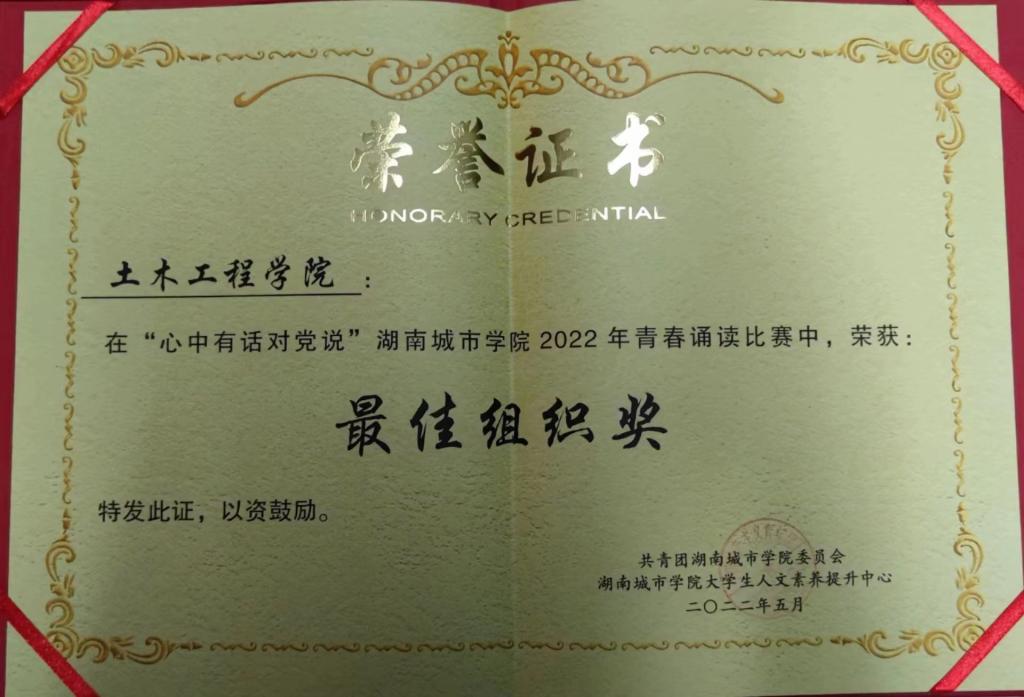经过激烈的角逐,我院荣获大赛二等奖以及最佳组织奖。我院将以此为契机,抓好专业知识教育的同时持续扎实开展语言文字工作,传承中华经典、弘扬时代精神、牢记根本使命、抒发家国情怀,为立德树人、培根铸魂打下坚实的基础,培育出一代代堪当时代大任的土木青年!