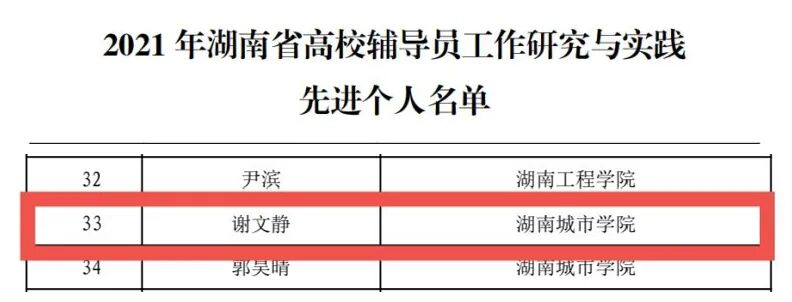我院辅导员谢文静获2021年湖南省高校辅导员工作研究与实践先进个人。