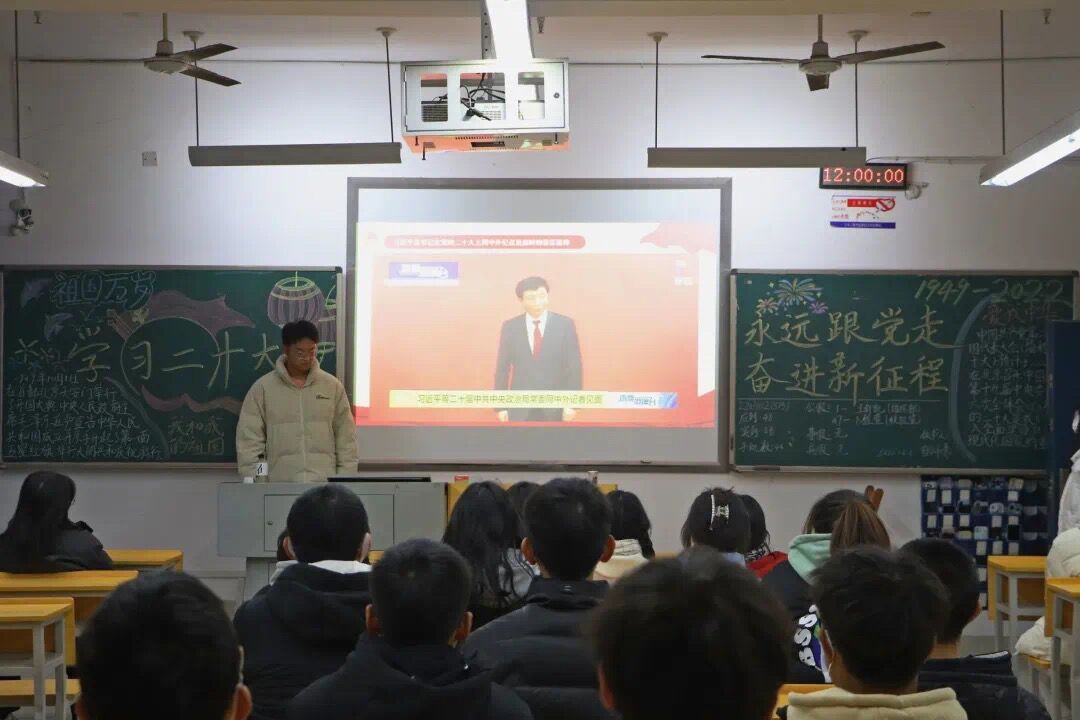 活动伊始,主持人带领全班同学学习“习近平总书记在中国共产党第二十次全国代表大会上的报告”。党的二十大报告中指出了过去五年的工作、新时代十年的伟大变革和新时代十年伟大变革的里程碑意义,指明中国共产党的庄严历史责任以及使命任务,并对什么是中国式现代化进行了阐述。其中对社会发展、教育、民主、法治、文化等十四个方面进行了分析与规划,提出了三个务必、三件大事、五个重大原则、五个“必由之路”。报告汇报了党的二十大对于党章的修订,强调了党章修订的好处。党章的修订集中反映了全体党员共同的期盼,充分体现了党的治国理政新理念、新思想、新战略,彰显了党坚持真理、与时俱进的精神品质。习近平总书记在庆祝中国共产主义青年团成立一百周年大会上的讲话中对中国共产主义青年团寄于希望,指出中国共青团应积极投身中华民族的伟大事业中。