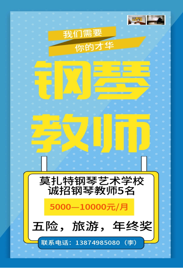 宁乡市维也纳钢琴艺术培训学校,需要招聘全职钢琴老师8名(钢琴入门老师5名车尔尼849水平,钢琴进级老师3名车尔尼299以上水平)。包吃住待遇4000到10000每月。联系电话:18684800480