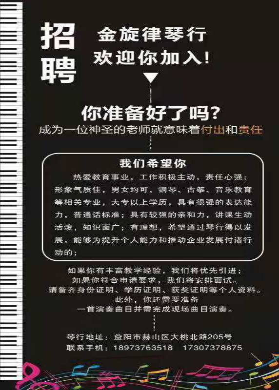 【岗位要求】钢琴教师要求599水平已上,有爱心,有耐心,热爱教学工作。
