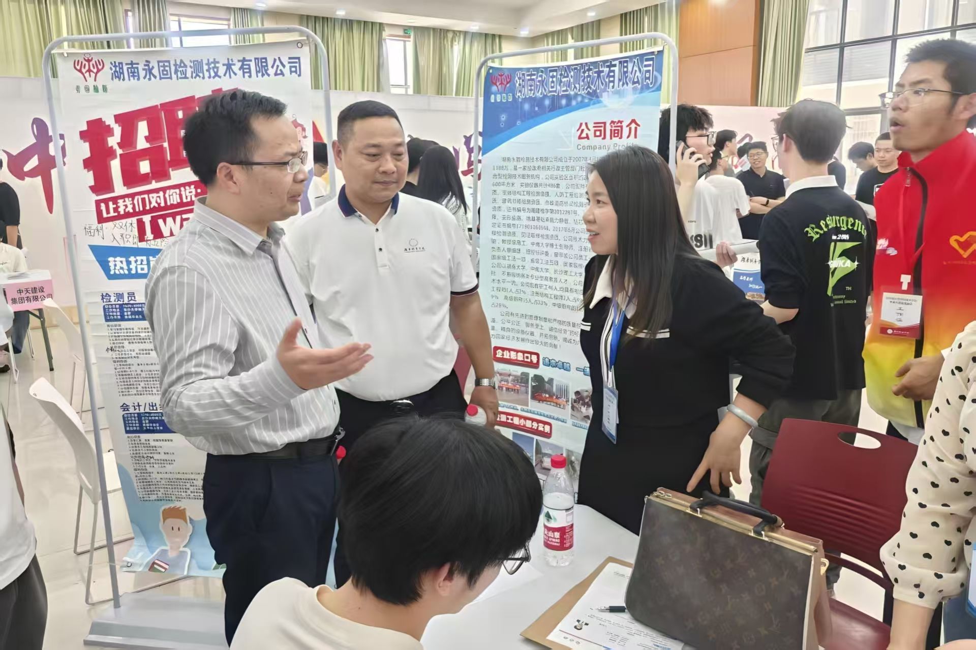 本次招聘会吸引了省内外30余家单位参与,涵盖土木工程、工程造价、水利水电工程、安全工程、城市地下空间、智能建造等专业领域。企业负责人通过播放宣传片、PPT展示、面对面交流等方式向同学们简介企业的概况、构成、未来发展方向等。同学们手持精心准备的简历,积极与招聘人员沟通,了解企业情况与岗位要求。招聘会现场气氛热烈,排队等候咨询的队伍蜿蜒曲折。
