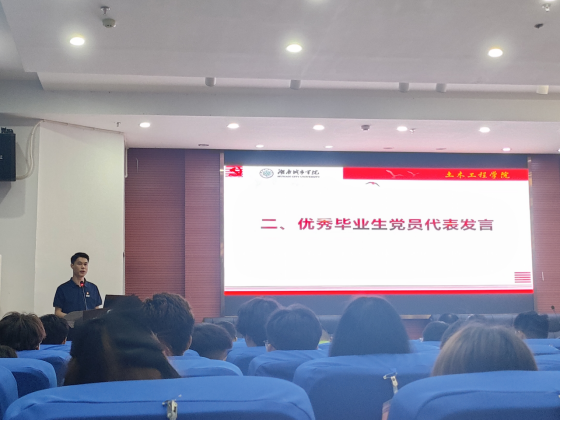 优秀毕业生党员代表谭鑫发言,以“不忘来时路,永葆赤子初心;不惑当下途,坚守纪律底线;不坠青云志,勇担使命重任”为感悟,代表全体毕业生党员向关心成长的学院党委和悉心教导的老师们敬意,承诺无论身在何处,都要让党徽闪耀,牢记老师叮嘱,以党章为镜、准则为尺,做到心有所畏、言有所戒、行有所止。