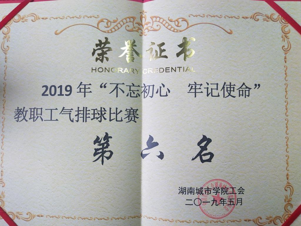 5月23-25日,湖南城市学院2019年“不忘初心 牢记使命”教职工气排球比赛在我校体育馆内隆重举行。学校共有18支队伍参加,比赛分两阶段进行,第一阶段采取分组循环制,第二阶段采取淘汰制。我院气排球队由8名参赛队员组成,全体队员奋力拼搏,在处于劣势时咬紧牙关,决不放弃,通过不懈努力,最终获得小组出线权,进入淘汰赛,在淘汰赛中不敌材化院代表队,最终获得第六名。