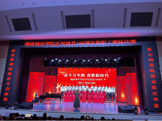 2021年7月1日晚,由学校党委主办,学校宣传部、工会、艺术学院承办的“湖南城市学院庆祝中国共产党成立100周年大合唱”在音乐厅举行。