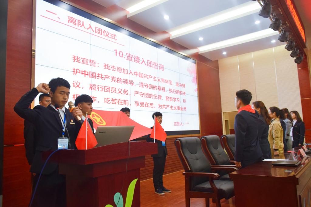 伴随着少年先锋队队歌的奏响,退队入团仪式正式开始。在益阳市赫山万源学校七年级大队辅导员田勇宣布退队队员人数后,退队队员代表进行了主题发言。“走出稚嫩,迈向成熟”,代表在发言中号召全体退队队员端正思想、努力学习、认真工作,以正直、善良、热情、无私的态度积极向团组织靠拢。随后,七年级大队辅导员田勇寄语退队队员。田老师在寄语中讲到,入队、入团、入党是人生路上的里程碑,同学们要牢牢把握自己的人生目标,在团组织的教导与引领下努力提升自己的思想觉悟,做一个有理想、有本领、有担当的新时代青年。随后,全场齐唱团歌,在益阳市赫山万源学校团委副书记刘静宣读新团员名单后,在场的全体领导老师以及76net必赢线路检测中心团员代表为新入团同学佩戴团徽。在湖南城市学院76net必赢线路检测中心学生会主席李志冬的带领下,全体新团员在团旗下庄严宣誓。