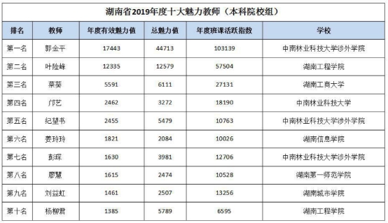 “湖南省2019年度十大魅力教师(本科院校组)”排名如下: