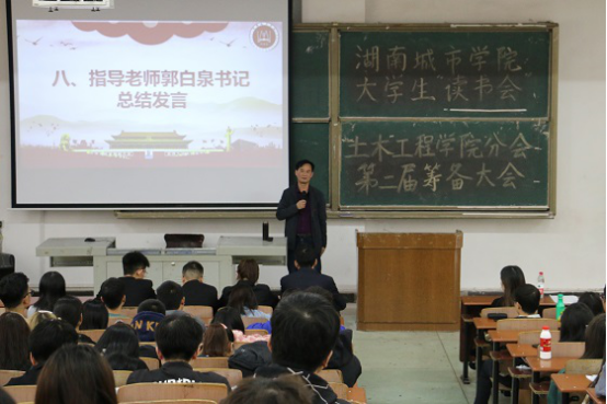 2020年11月19日中午,湖南城市学院“习近平新时代中国特色社会主义思想读书会”(以下简称“读书会”)76net必赢线路检测中心分会第二届筹备工作会议,在一教学楼108教师召开,学院党委书记郭白泉出席会议并主讲第一课。