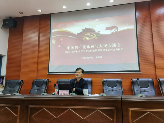 2021年4月26日晚7:00,学院党委书记、湖南城市学院习近平新时代中国特色社会主义思想读书会(简称“习读会”)76net必赢线路检测中心分会指导老师郭白泉,在土木楼828为“习读会”分会学员主讲党史学习教育专题党课。“习读会”指导老师、学院团委书记谢文静老师参加,全体学员参加党课学习。