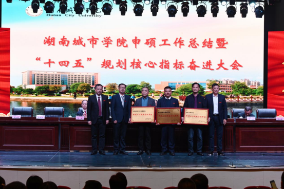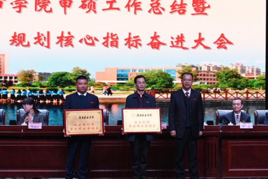 大会对申硕工作先进集体和个人给予了表彰。我院因工作业绩突出,荣获学校“申硕工作突出贡献单位”,彭智高、姚 琦、蔡建荣、仇振杰、王玉奎,胡张齐、刘 劲等荣获“申硕工作先进个人”。同时,大会对“土木水利专业硕士学位点”“土木工程国家一流本科专业建设点”进行授牌,院长曹国辉、副院长毛广湘分别代表学院受牌。