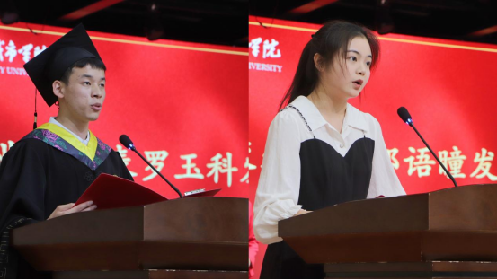 1903602班的罗玉科同学和2203901班的邹语瞳同学作为毕业生代表和在校学生代表在毕业典礼上先后发言。