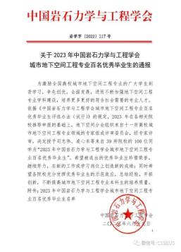 日前,在中国岩石力学与工程学会发布的《关于2023年中国岩石力学与工程学会城市地下空间工程专业百名优秀毕业生的通报》中,我院城市地下空间工程专业2019级毕业生罗玉科同学从全国几十所高校的近万名毕业生中脱颖而出,获评“2023年全国城市地下空间工程专业百名优秀毕业生”。实现该奖项在我校的历史性突破,为学校、学院赢得了荣誉。该奖项由中国岩石力学与工程学会主办,面向全国高校地下空间专业应届毕业生,旨在激励、表彰城市地下空间工程专业广大学生勤学苦练、争先创优、全面发展、报效祖国,自2016年起已连续8年举办“中国岩石力学与工程学会城市地下空间工程专业优秀毕业生评选活动”,我校优秀毕业生罗玉科同学是第一次报名参评并荣获该项殊荣。