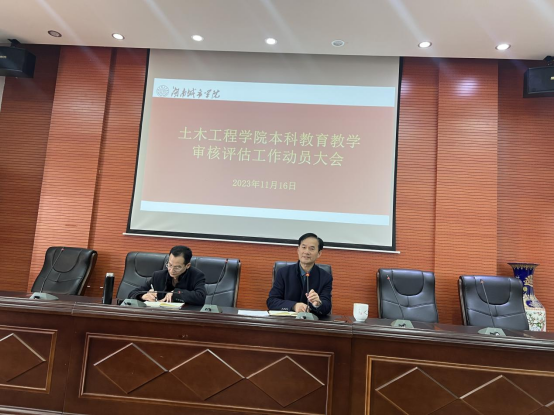 2023年11月16日下午2:30,学院在土木楼828报告厅组织召开新一轮本科教育教学审核评估工作动员大会,全体院领导和全院教职工参加,院党委书记郭白泉主持动员大会。