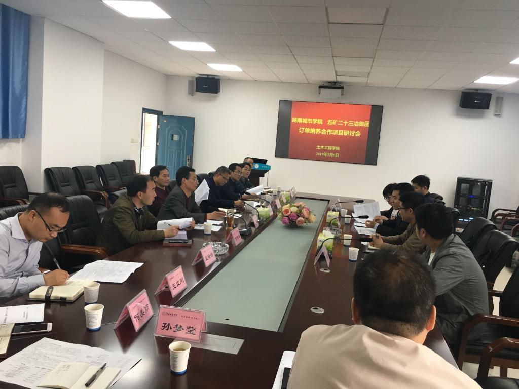 (土木院通讯员 周宏波) 5月9日11:00,湖南城市学院与五矿二十三冶建设集团有限公司在土木楼召开“五矿二十三冶班”订单培养合作项目研讨会。同日下午2:00,五矿二十三冶实习生宣讲面试会在土木楼828举行。五矿二十三冶建设集团人力资源部部长惠虎东,五矿二十三冶建设集团绿建工程有限公司党委副书记、副总经理崔栋彧、综合办公室主任周艾菲、湖南城市学院76net必赢线路检测中心院长曹国辉、党委书记郭白泉、副院长付贵海、王新忠、副书记王传浩、院长助理毛广湘以及土木工程、工程造价系主任、招生就业处代表等参加了本次研讨会。